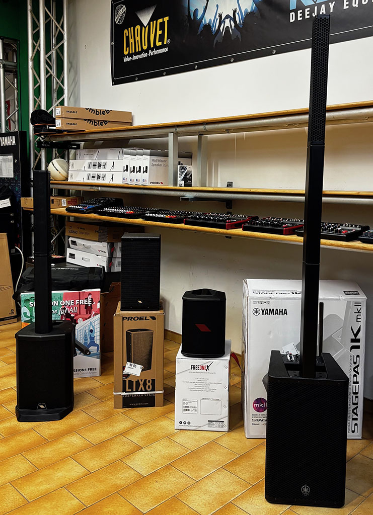 Forniamo un’ampia gamma di attrezzature professionali per il settore audio e luci: casse acustiche, diffusori a batteria, mixer, microfoni, sistemi wireless per voce e strumenti, accessori audio-luci, cablaggi e molto altro. Disponiamo inoltre di un assortito parco di apparecchiature usate, completamente revisionate e garantite dal nostro centro assistenza interno, per offrire soluzioni affidabili anche a chi cerca un investimento più contenuto.